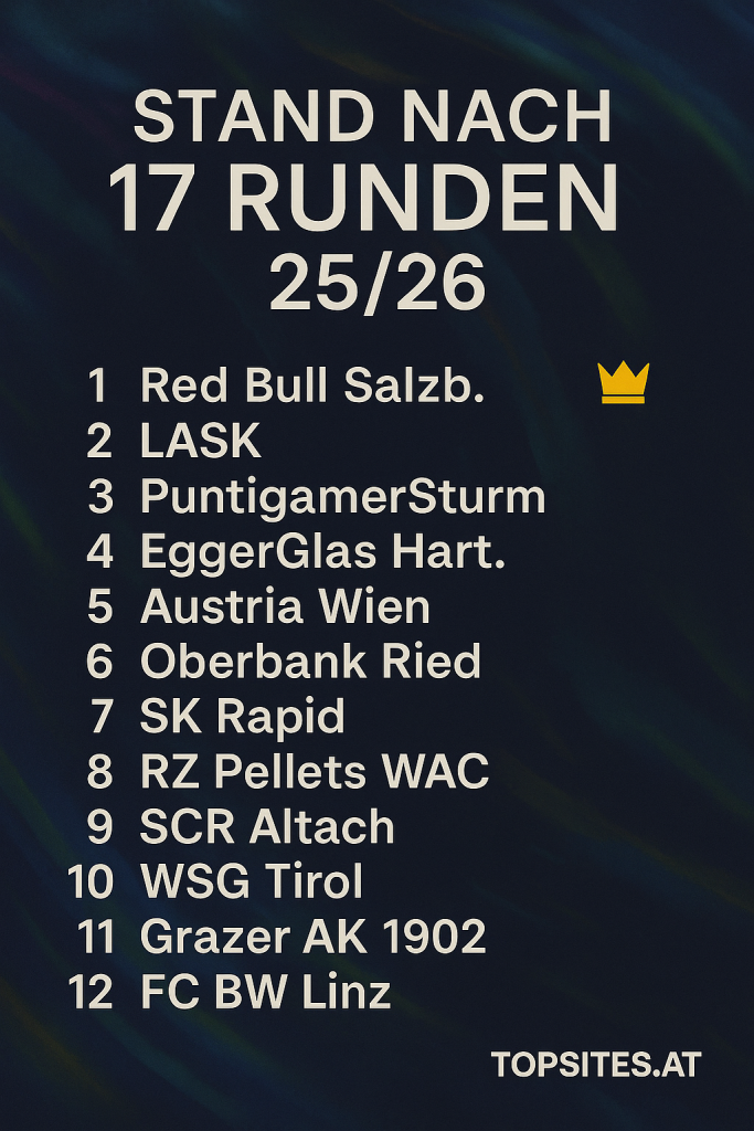 Red Bull Salzburg führt die Tabelle nach 17 Runden an, doch diese Führung ist kein „Durchmarsch“, sondern ein ehrgeizig verteidigter Spitzenplatz. Mit rund 32 Punkten aus 17 Spielen hat Salzburg seine Qualität bewiesen – doch der Vorsprung ist minimal, und der Angriff der Verfolger sitzt ihnen im Nacken.